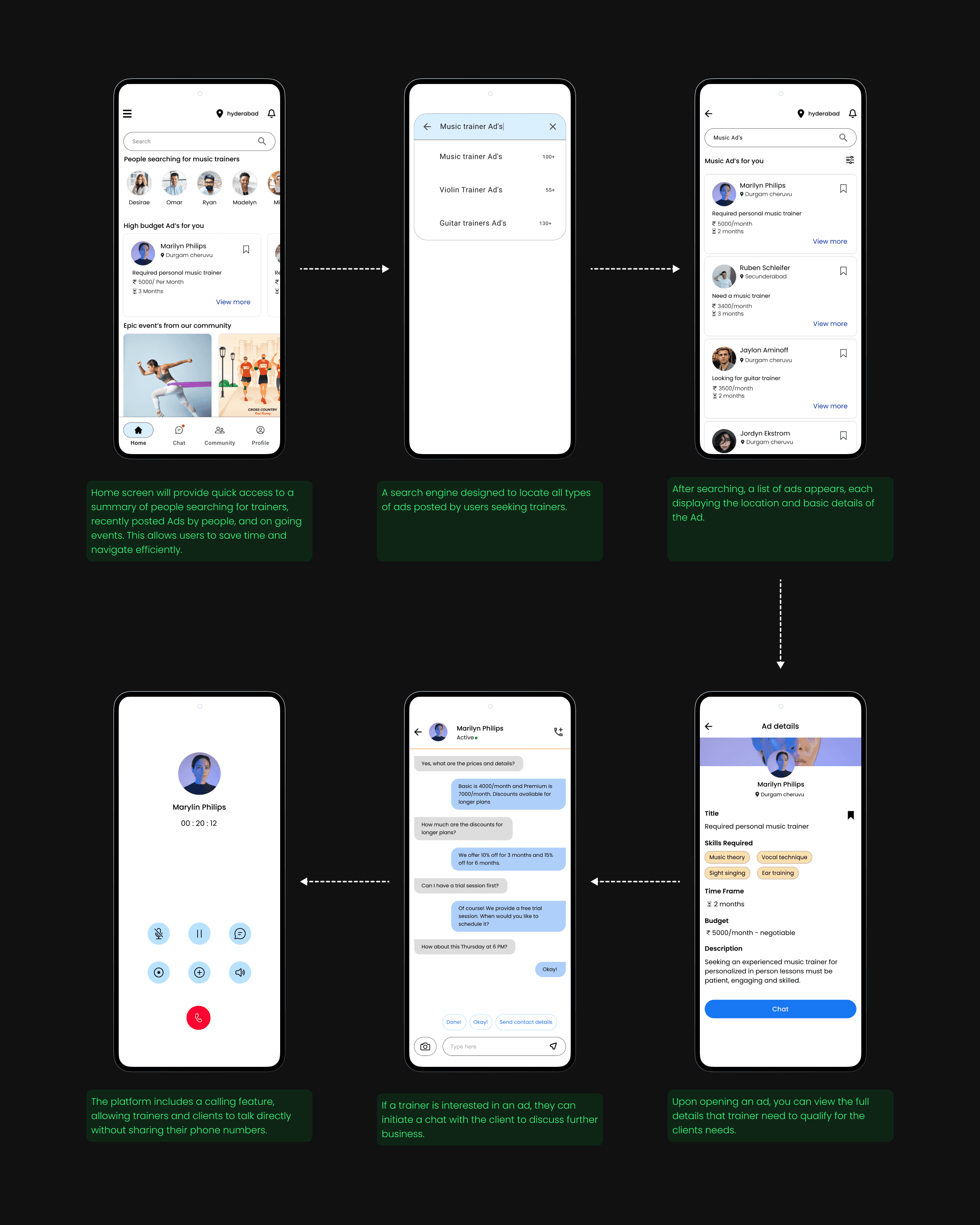 Trainers can search for specific ads posted by clients. When they find an interesting ad, they can communicate with the client to discuss further business.
