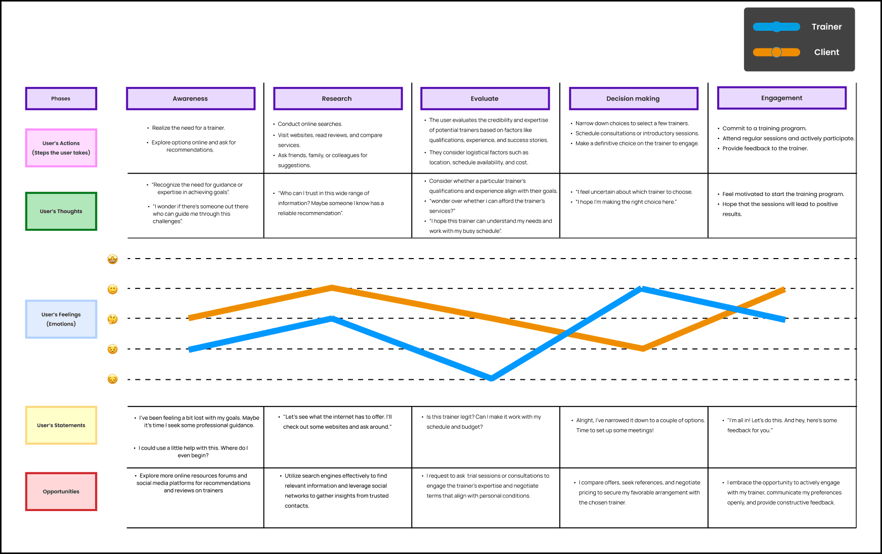 By detailing the experiences of both trainers and clients, from planning to final interaction, I was able to identify where challenges occur and where the experience breaks down.